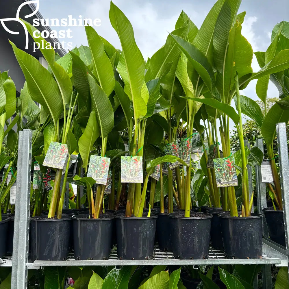 Heliconia 'Kawauchi' is a distinctive tropical perennial known for its elegant, pendulous bracts that showcase a combination of red, yellow, and green hues. These vibrant bracts hang gracefully from tall stems, creating a bold and exotic display in garden landscapes from late spring through autumn. Growing to a height of 3.5–4 meters, 'Kawauchi' is ideal for adding vertical interest, colour, and tropical flair to garden beds, or large containers.
