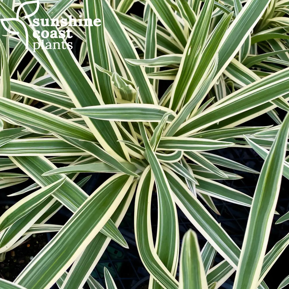 Dianella 'Silver Streak' is an attractive, low-maintenance evergreen perennial known for its striking variegated foliage with green leaves accented by silver stripes. This hardy, clumping plant brings texture and colour to landscapes and is valued for its year-round beauty. In spring and summer, 'Silver Streak' produces delicate blue flowers on tall stems, followed by small, decorative blue berries. Growing to a height of 60–80 cm, this Dianella is ideal for mass planting, borders, and containers, adding a modern touch to both formal and informal gardens.