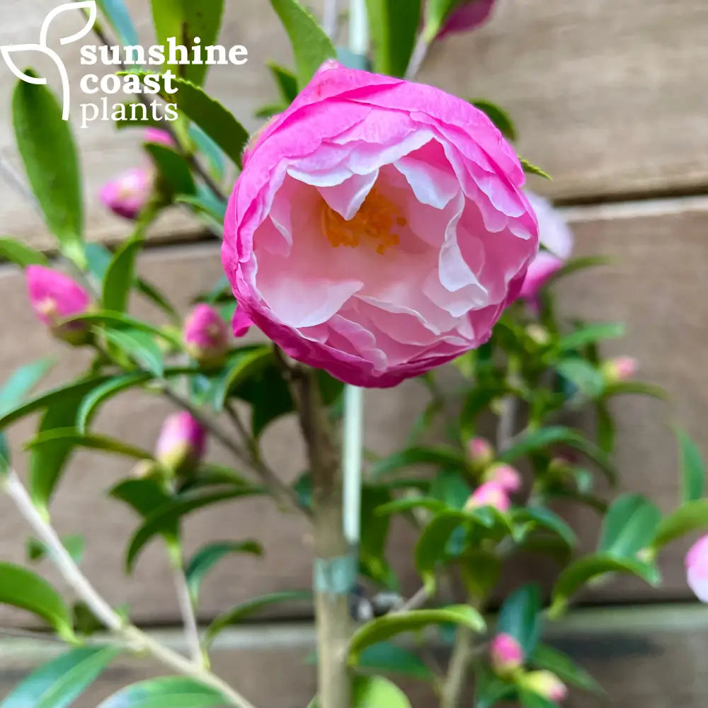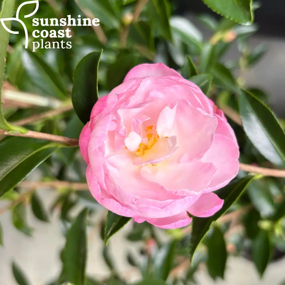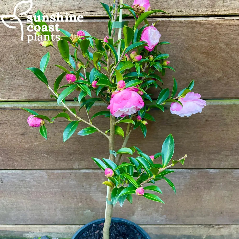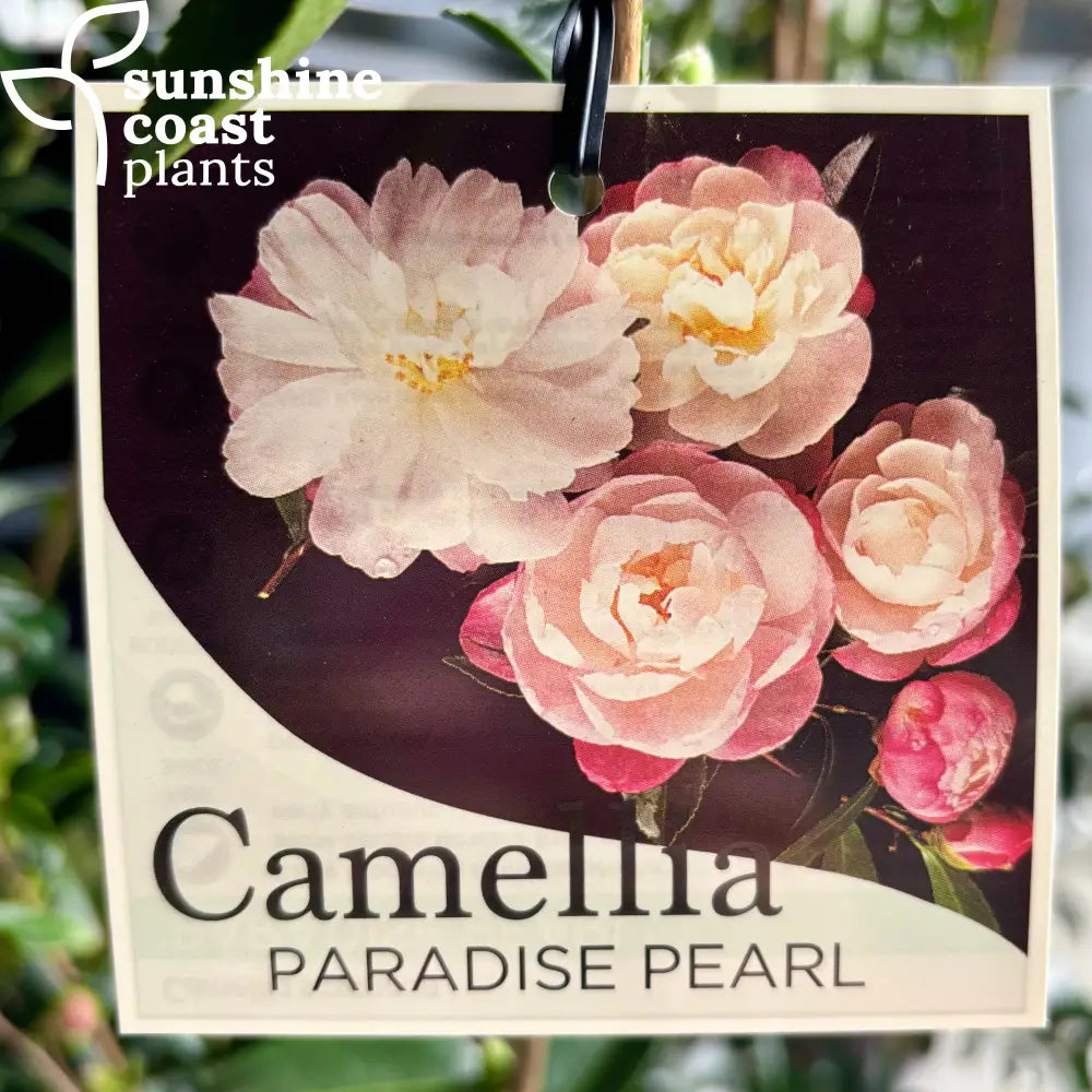 Camellia sasanqua 'Paradise Pearl' is a graceful evergreen shrub that produces semi-double, pure white blooms with a delicate blush of soft pink at the edges. Flowering from autumn to early winter, these elegant blooms stand out beautifully against the deep green, glossy foliage, bringing a classic charm to shaded and semi-shaded areas. Growing to a height of 1.5–2.5 meters, 'Paradise Pearl' is an excellent choice for hedging, screening, or as a feature plant in garden beds and containers.