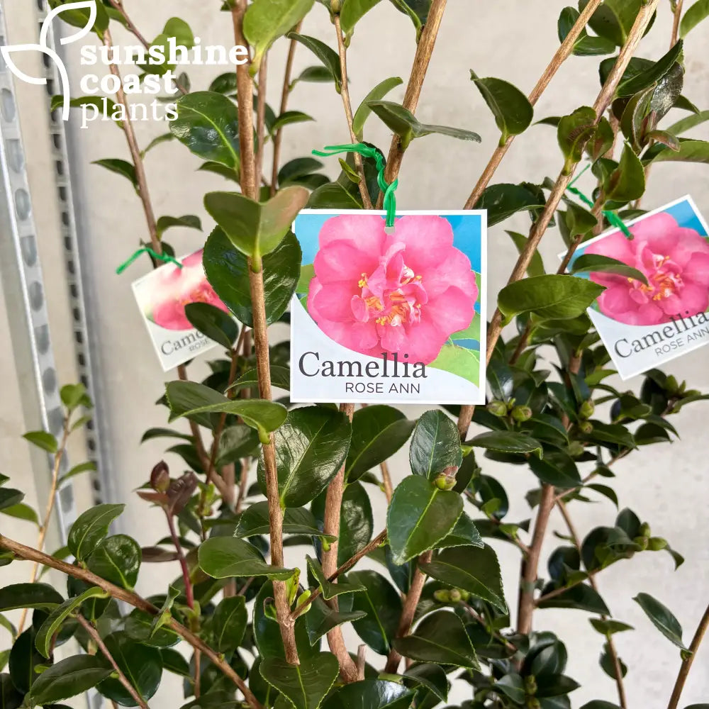 Camellia sasanqua 'Rose Anne' is a charming evergreen shrub featuring semi-double, rose-pink blooms with delicate ruffled petals and a prominent cluster of yellow stamens at the center. Blooming from autumn to early winter, 'Rose Anne' provides a burst of soft colour against its rich, glossy green foliage, brightening shaded areas during the cooler months. Growing to a height of 1.5–2 meters, this versatile shrub is ideal for hedging, screening, or as a feature plant in garden beds and containers.