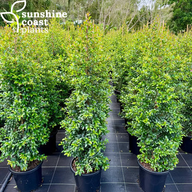 Syzygium australe 'Straight & Narrow™️,' commonly known as Straight & Narrow™️ Lilly Pilly, is a compact, evergreen shrub prized for its extremely narrow, upright growth habit and dense, glossy green foliage. Ideal for creating privacy screens, hedges, and feature accents in small spaces, this versatile shrub also produces small, fluffy white flowers in spring, followed by occasional edible red berries. Growing to a height of 5–8 meters but only 0.5–1 meter wide, Straight & Narrow™️ is perfect for narrow spaces and low-maintenance landscaping.