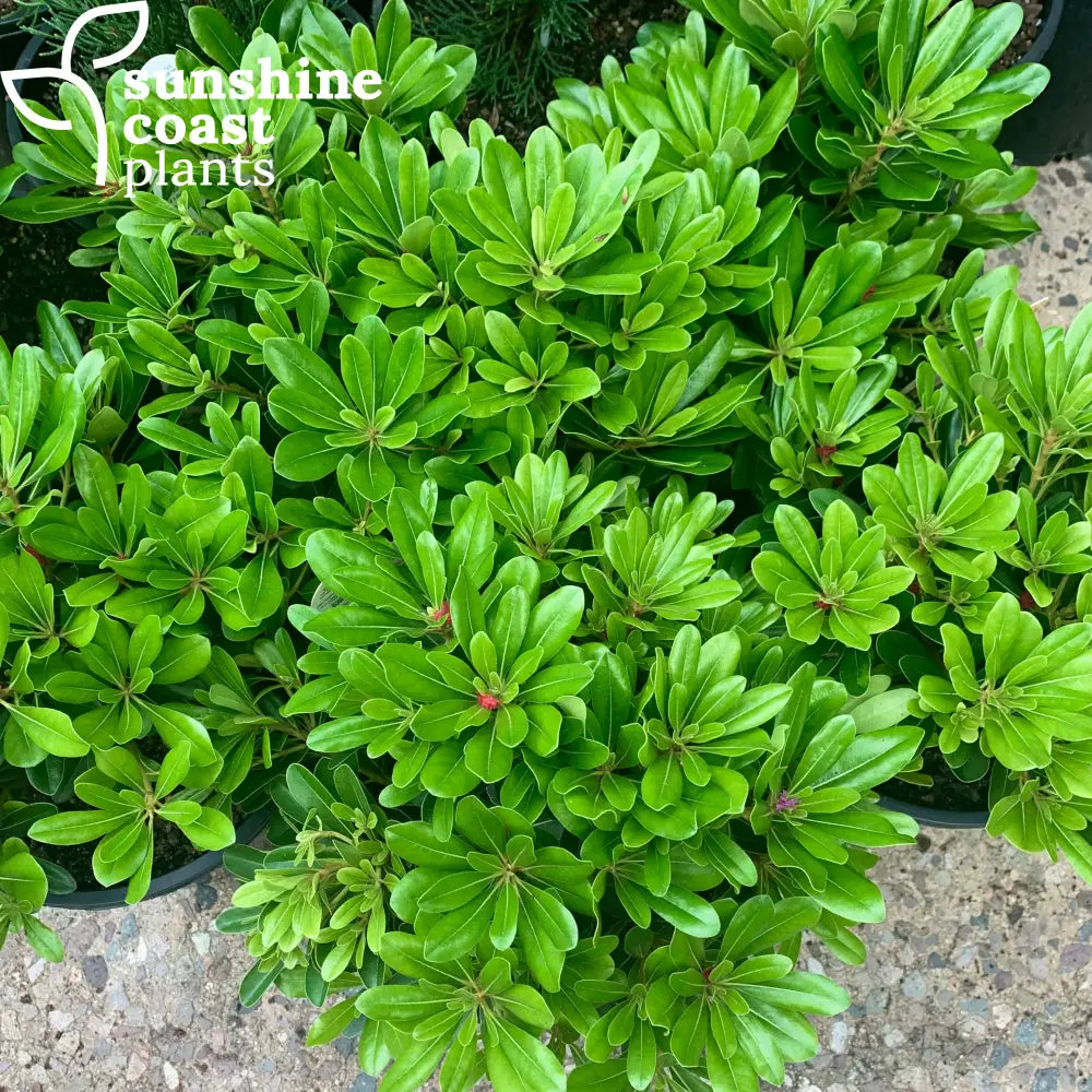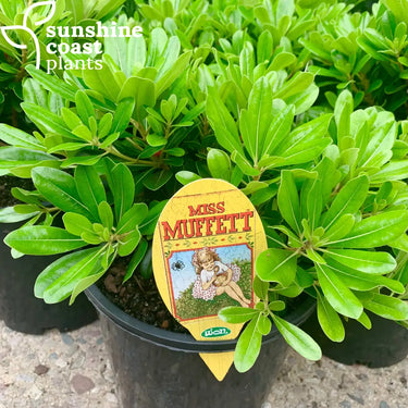 Pittosporum 'Miss Muffet,' is a compact, evergreen shrub admired for its small, rounded, lime-green foliage that matures to a soft green, creating a lush and delicate appearance. Its naturally dense and mounded growth habit makes it an excellent choice for borders, low hedges, or as a feature plant in garden beds or containers. Growing to a height of 0.8–1 meter, 'Miss Muffet' is perfect for small gardens or formal designs.