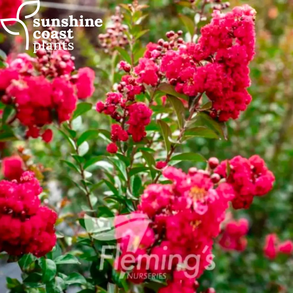Lagerstroemia ‘Ruffled Red Magic’, part of The Magic Series®, is a stunning deciduous shrub or small tree known for its vibrant, ruffled deep red flowers and lush, dark green foliage. The rich blooms appear in abundance throughout summer and into early autumn, creating a bold display of colour. With its compact, rounded form and long flowering season, ‘Ruffled Red Magic’ is ideal for feature planting, low hedges, or vibrant borders. It typically grows to 4m in height.