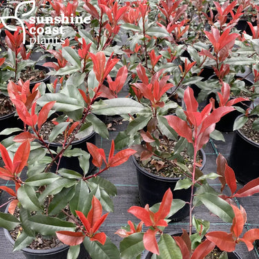 Photinia 'Red Robin' is a popular evergreen shrub prized for its vibrant red new foliage that matures to a glossy dark green, providing year-round colour and interest. Its dense, bushy growth and striking foliage make it an excellent choice for hedging, screening, or as a feature plant. In spring, small white flowers appear, adding seasonal charm. Growing to a height of 3–4 meters, 'Red Robin' is versatile and suitable for both formal and informal garden designs.
