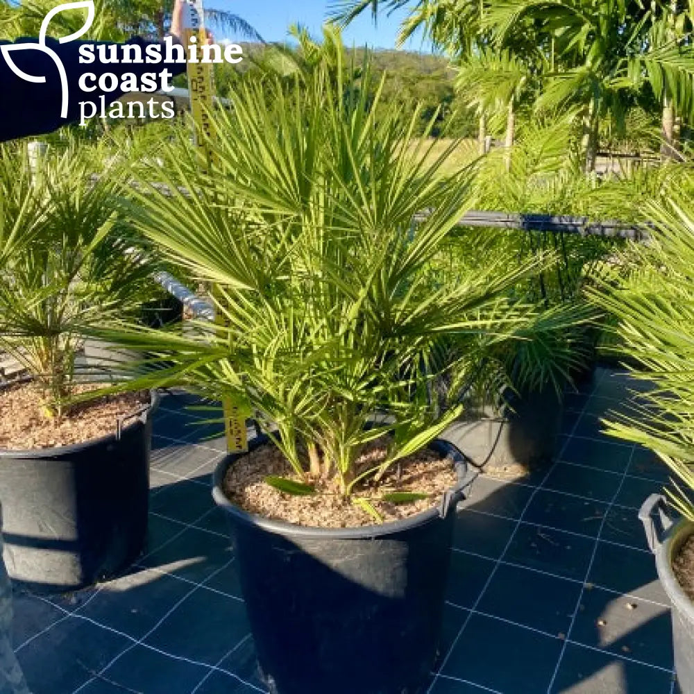 This slow-growing, clumping palm reaches a mature height of 2-3 metres with a similar spread. Its dense, bushy growth and fan-like fronds make it an excellent choice for adding texture and structure to gardens, creating privacy screens, or as a feature plant in rock gardens and Mediterranean-style landscapes.