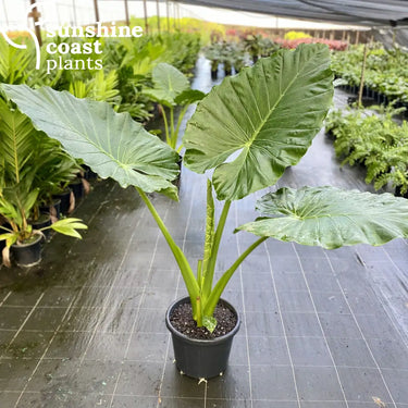 Alocasia 'Calidora,' also known as Persian Palm or Elephant Ear, is a striking tropical perennial admired for its impressive, large, emerald-green leaves with a slightly ruffled texture. Its bold, upright foliage grows on sturdy, thick stems, creating a dramatic focal point in gardens or indoor spaces. Reaching up to 1.5–2 meters in height, 'Calidora' adds height, texture, and a lush, exotic feel to any setting.