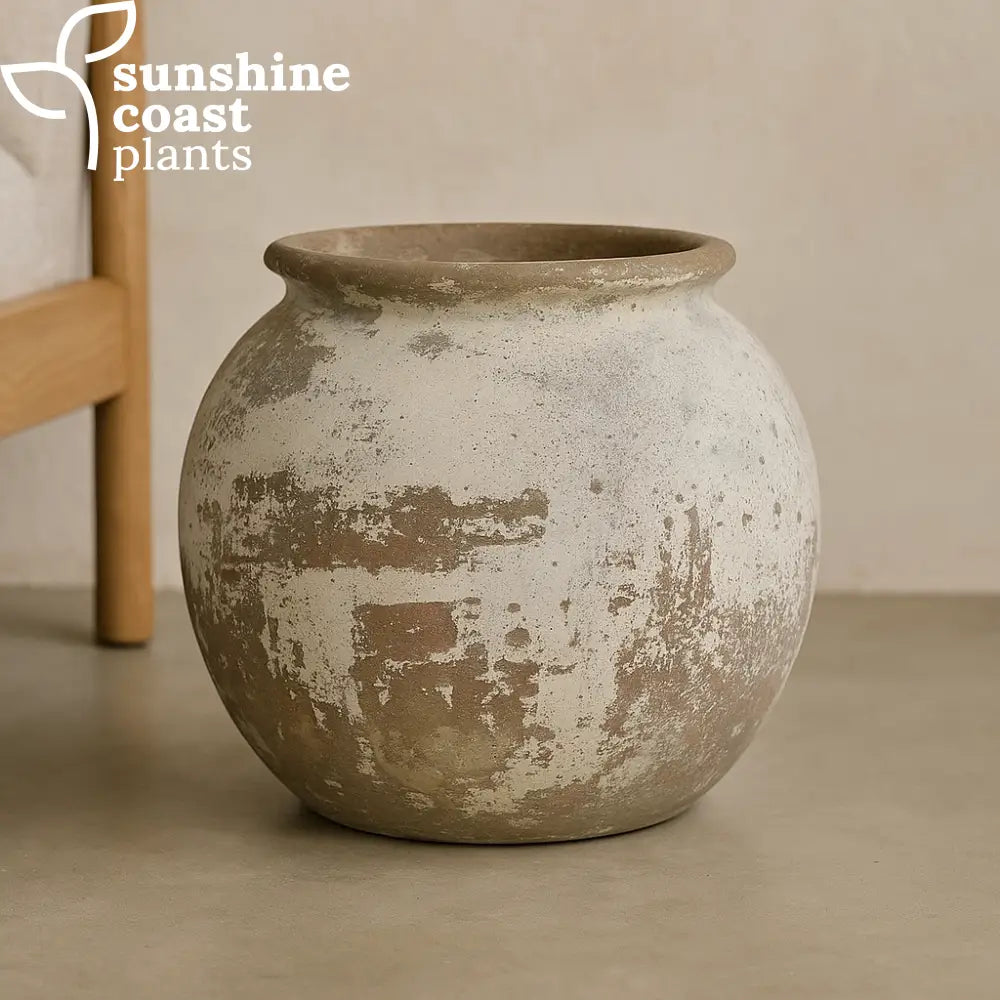 Rustic charm meets refined form. The Limestone Cassis Pot offers a weathered elegance that captures the beauty of aged stoneware. With its soft curves, wide belly, and gently flared rim, this vessel draws inspiration from traditional Mediterranean urns while maintaining a contemporary, grounded presence. The textured, chalky finish in earthy tones makes each piece feel like a one-of-a-kind find, perfect for adding artisanal character to any interior or garden setting.